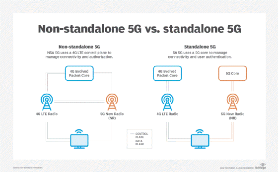 Sự khác biệt chính của NSA (Kiến trúc không độc lập) và SA (Kiến trúc độc lập) là NSA gắn tín hiệu điều khiển của mạng vô tuyến 5G với lõi 4G, trong khi sơ đồ SA kết nối trực tiếp đài 5G với mạng lõi 5G và tín hiệu điều khiển hoàn toàn không phụ thuộc vào mạng 4G. NSA, như tên cho thấy, là dịch vụ 5G không 'độc lập' mà được xây dựng trên mạng 4G hiện có. Mặt khác, SA cho phép vận hành dịch vụ 5G hoàn toàn độc lập mà không có bất kỳ tương tác nào với lõi 4G hiện có.