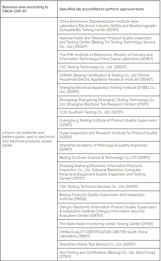 According to the Chinese Standard CNCA-C09-01 for lithium-ion batteries and accumulators, the CCC certification process requires product testing to the applicable GB standard in an accredited Chinese test laboratory. CNCA designated 20 test labs throughout China for this purpose, whose names and contact information were also published as part of the announcement.