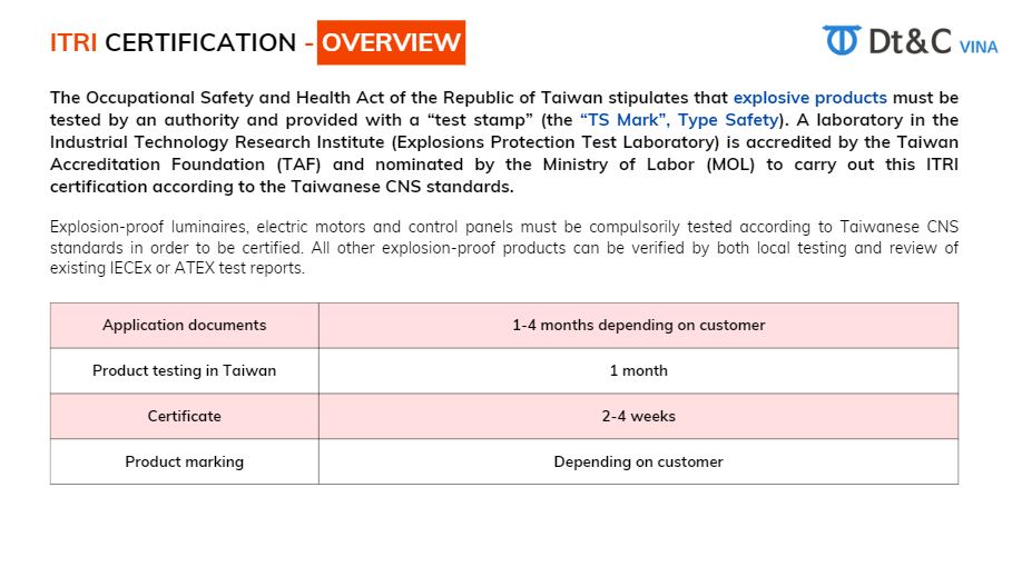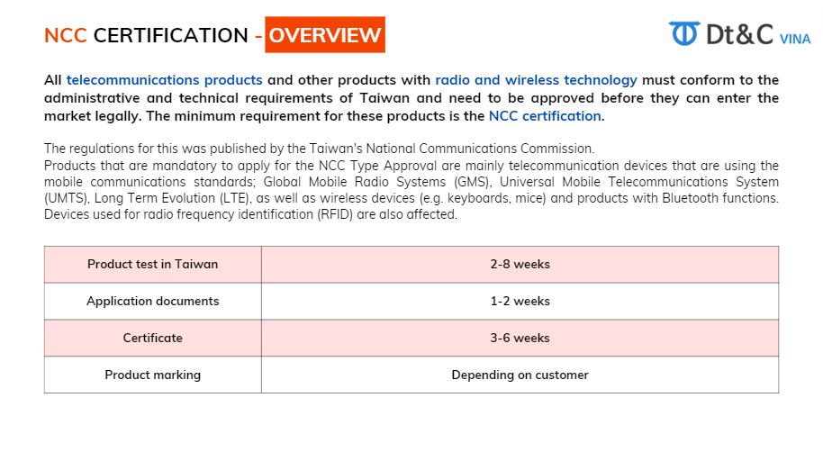 Theo số liệu thống kê mới nhất từ Bộ Kinh tế Đài Loan, Việt Nam là một trong 5 quốc gia và vùng lãnh thổ mà các doanh nghiệp Đài Loan đầu tư nhiều nhất (sau Hungary, British Virgin Islands, Hồng Kông và Mỹ). Đặc biệt, các doanh nghiệp trong lĩnh vực kinh doanh, sản xuất các thiết bị điện - điện tử, đồ gia dụng ngày càng phát triển và mở rộng kinh doanh thông qua các chi nhánh đặt tại Việt Nam. Thông qua đó, các doanh nghiệp Việt Nam cũng nhanh chóng nắm bắt được tình hình, các cơ hội và thách thức trong nền kinh tế đang dần phục hồi sau khi trải qua dịch bệnh Covid, các nhu cầu xuất nhập khẩu hàng hóa, sản phẩm sang thị trường Đài Loan ngày càng được đẩy mạnh. Tuy nhiên, các doanh nghiệp vẫn đang gặp khó khăn khi tiếp cận đến các yêu cầu, quy định xin chứng nhận cho các thiết bị điện, điện tử, đồ gia dụng... khi xuất khẩu sang thị trường này. Nắm bắt được tâm lý cũng như nhu cầu của các doanh nghiệp, nhà sản xuất, để giúp khách hàng tăng doanh thu, giảm thiểu tối ưu chi phí, Dt&C Vina sẽ chuẩn bị, hỗ trợ mọi thủ tục hướng dẫn cho khách hàng một cách nhanh chóng và kịp thời nhất với sự hiểu biết sâu rộng, phong cách làm việc chuyên nghiệp, từ đó giúp khách hàng có thể kết nối, mở ra nhiều cơ hội hợp tác kinh doanh với các doanh nghiệp tại thị trường Đài Loan.