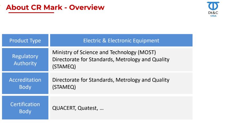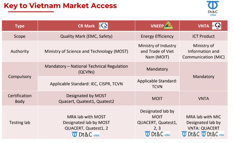 Hầu hết các sản phẩm khi đưa vào thị trường Việt Nam đều phải đáp ứng các yêu cầu liên quan của cơ quan chức năng. Một số chứng nhận cho các thiết bị điện tử, điện tử, công nghệ thông tin tại Việt Nam như: Chứng nhận hơp quy CR, Chứng nhận Tiết kiệm Năng lượng (VNEEP), ... Điều này đặt ra rất nhiều thách thức cho các nhà sản xuất và nhập khẩu trong quá trình đưa sản phẩm vào thị trường Việt Nam.