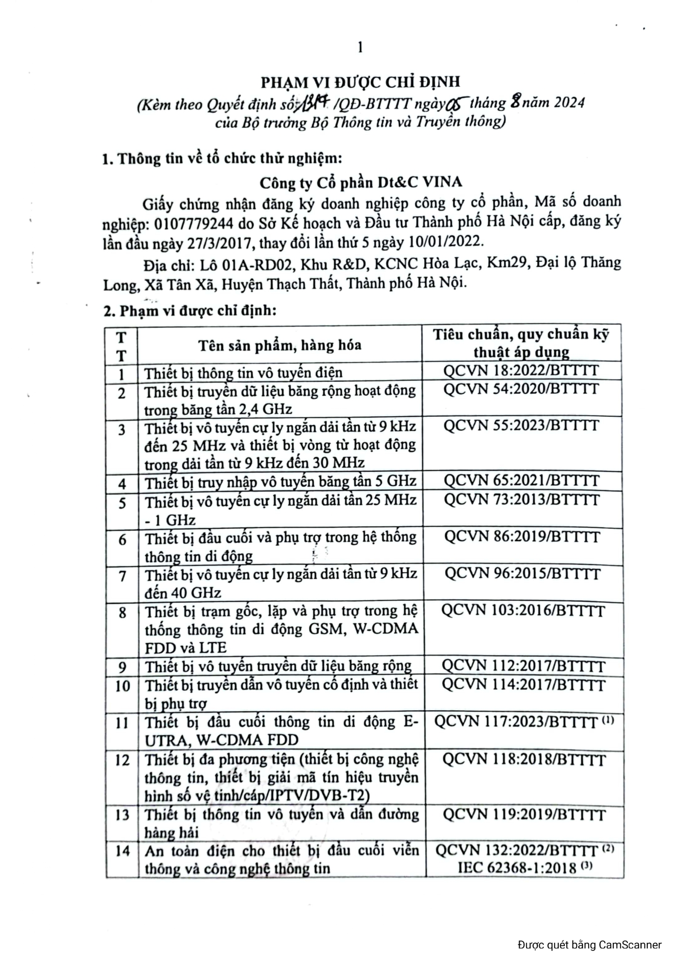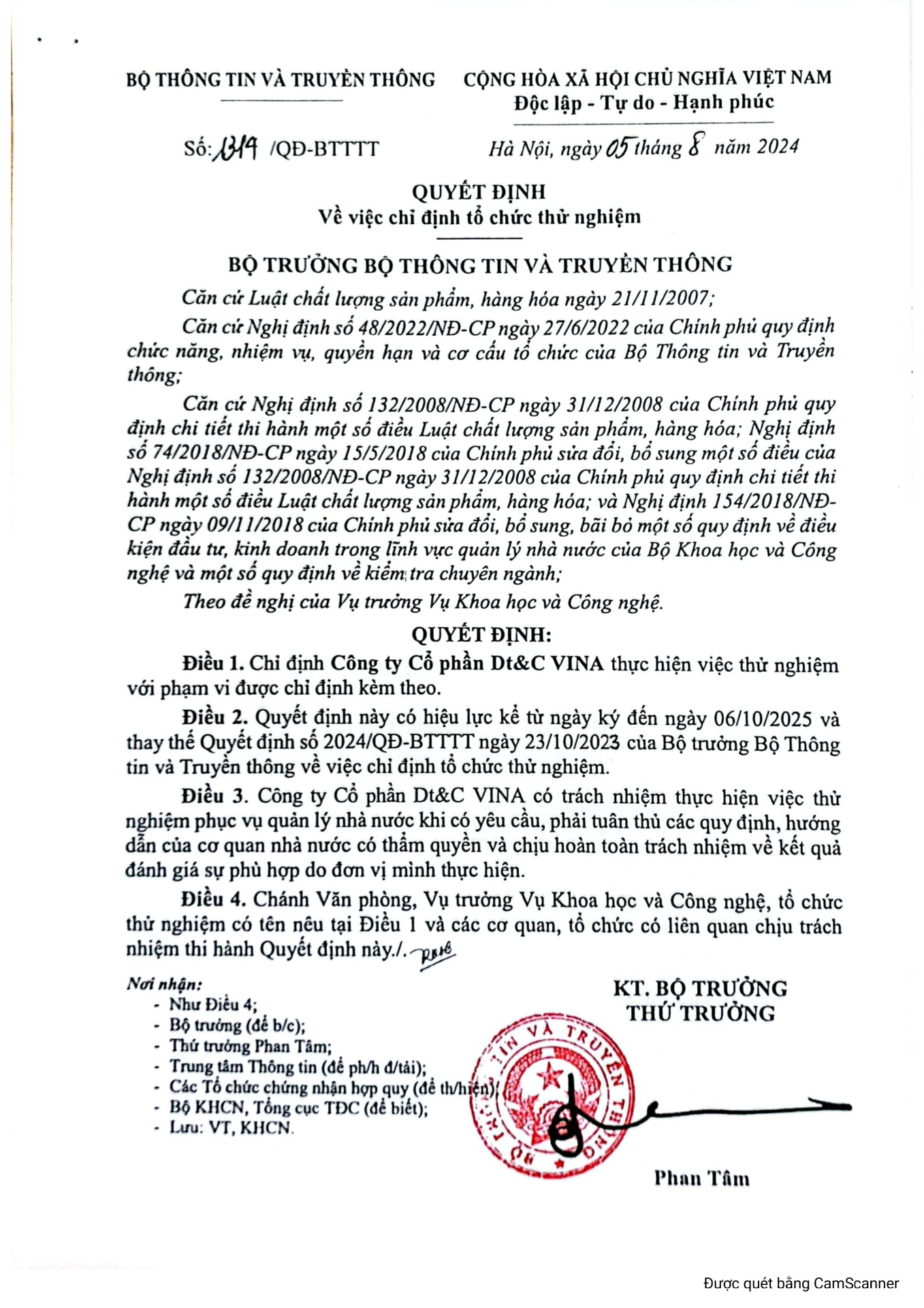 Dt&C VINA chính thức nhận được cấp phép thực hiện QCVN 55:2023/BTTTT và QCVN 117:2023/BTTTT, với quy trình làm việc nghiêm ngặt, tuân thủ quy định phòng lab cùng đội ngũ kỹ sư, chuyên gia giàu kinh nghiệm, chúng tôi cam kết thực hiện đúng quy trình và yêu cầu kỹ thuật theo quy định của nhà nước, đảm bảo tiến độ dự án, kết quả thử nghiệm chính xác và nhanh chóng tới cho quý khách hàng. Các sản phẩm thử nghiệm tại phòng lab Dt&C VINA đều phải được bảo mật tuyệt đối theo quy định.