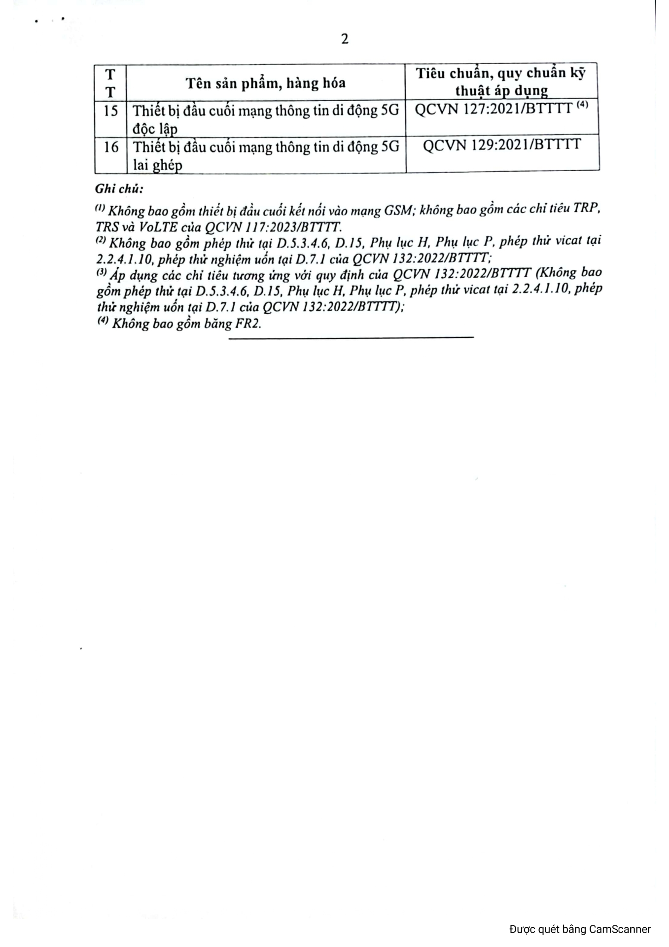 | QCVN 117:2023/BTTTT | Quy chuẩn này quy định các yêu cầu kỹ thuật phần truy nhập vô tuyến của các thiết bị đầu cuối thông tin di động mặt đất GSM, W-CDMA, E-UTRA gồm máy điện thoại di động và các thiết bị đầu cuối thông tin di động mặt đất không phải máy điện thoại di động. Máy điện thoại di động phải sử dụng công nghệ E-UTRA, hỗ trợ tính năng thoại VoLTE và hoạt động trên toàn bộ hoặc một trong các băng tần quy định từ Bảng 1 đến Bảng 5 và tuân thủ các quy định kỹ thuật tại mục 2 của Quy chuẩn này. Trường hợp máy điện thoại di động có tích hợp công nghệ W-CDMA FDD phải tuân thủ thêm các yêu cầu kỹ thuật quy định tại Phụ lục B của quy chuẩn này; trường hợp máy điện thoại di động có tích hợp công nghệ GSM phải tuân thủ thêm các yêu cầu kỹ thuật quy định tại Phụ lục C của quy chuẩn này. Thiết bị đầu cuối thông tin di động mặt đất không phải máy điện thoại di động nếu tích hợp/sử dụng công nghệ E-UTRA thì phải hoạt động trên toàn bộ hoặc một trong các băng tần quy định từ Bảng 1 đến Bảng 5 và tuân thủ các yêu cầu kỹ thuật quy định tại mục 2 của quy chuẩn này; trường hợp nếu tích hợp/sử dụng công nghệ W-CDMA FDD phải tuân thủ các yêu cầu kỹ thuật quy định tại Phụ lục B của quy chuẩn này; trường hợp nếu tích hợp/sử dụng công nghệ GSM phải tuân thủ các yêu cầu kỹ thuật quy định tại Phụ lục C của quy chuẩn này. Quy chuẩn này không quy định các yêu cầu kỹ thuật phần truy nhập vô tuyến sử dụng công nghệ NB-IoT, LTE-M và 5G. Chi tiết QCVN 117:2023/BTTTT xem tại đây. |