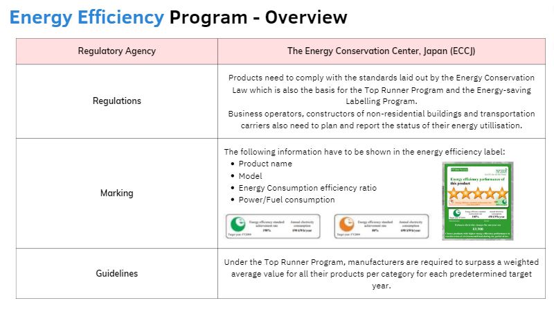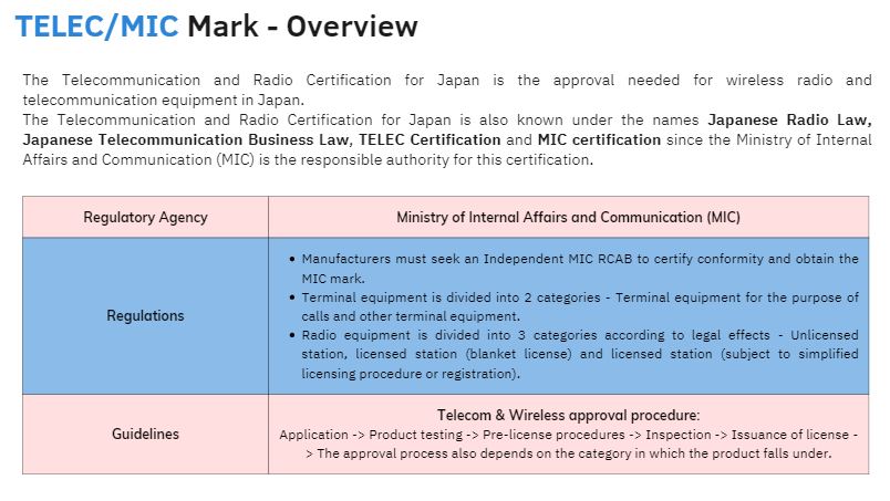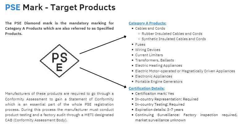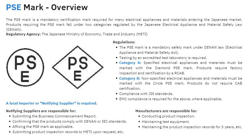 In Japan, the Ministry of Economy, Trade, and Industry (METI) is the regulatory agency responsible for the Electrical Appliance and Material Safety Law which regulates the manufacture and sale of electrical and electronic products. Products enter this maket assures that they comply with Japanese regulations. Some main certifications in Japan are the PSE Mark, VCCI Mark, MIC and the Japan Energy Efficiency.