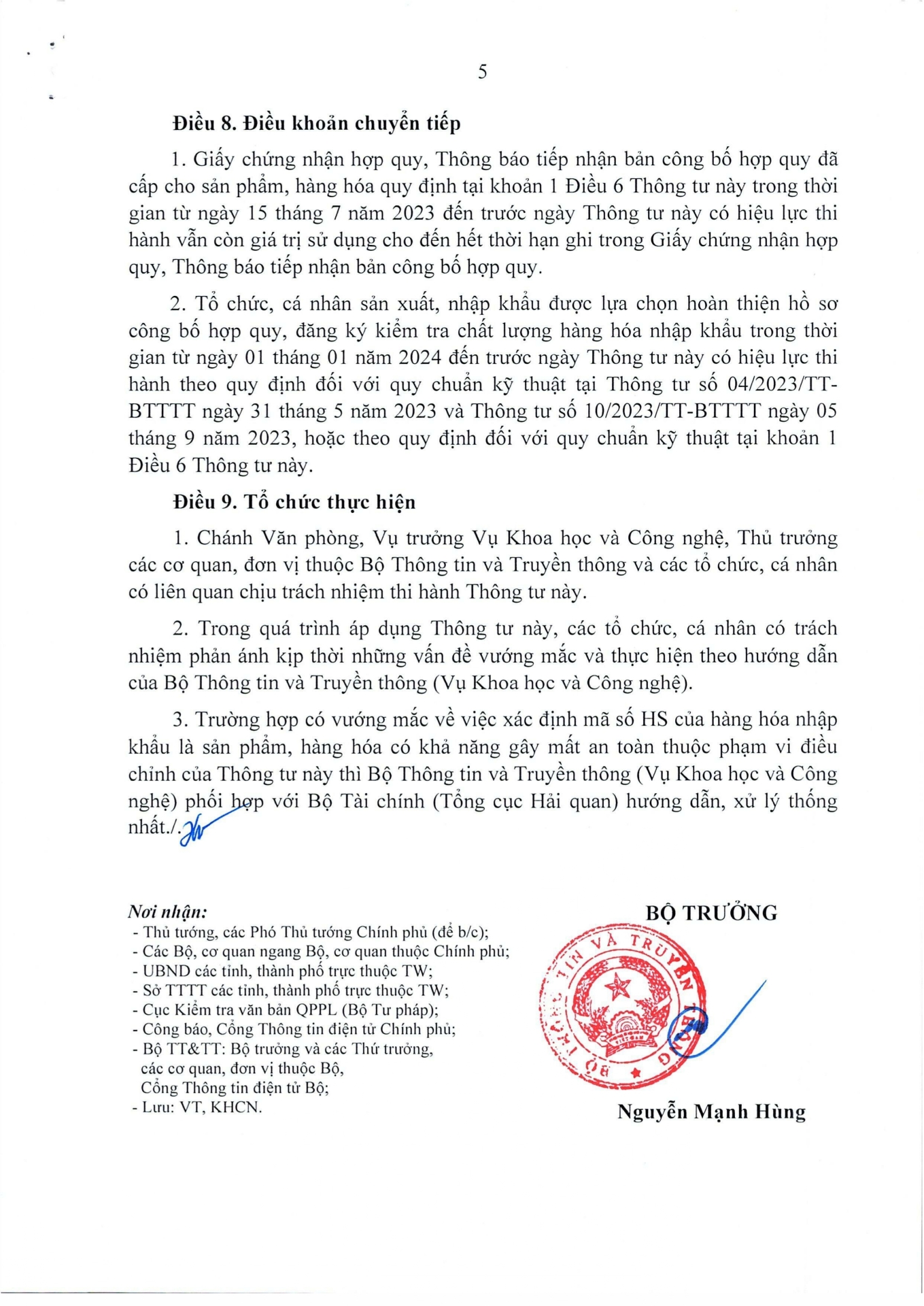 5) From January 1, 2024 to before May 15, 2024, importers and manufacturers can choose to complete dossiers announcing conformity and register for state quality inspection of imported goods for with QCVN specified in Circular 04/2023/TT-BTTTT dated May 31, 2023 and Circular 10/2023/TT-BTTTT dated September 5, 2023 or according to the provisions of this Circular.