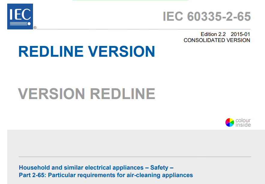 IEC 60335-2-65:2002+A1:2008+A2:2015 Deals with the safety of electric air-cleaning appliances, their rated voltage being not more than 250 V for single phase and 480 V for other appliances, for household purposes. Also includes appliances intended to be used by laymen in shops, in light industry and on farms. This consolidated version consists of the second edition (2002),its amendment 1 (2008) and its amendment 2 (2015). Therefore, no need to order amendments in addition to this publication.
