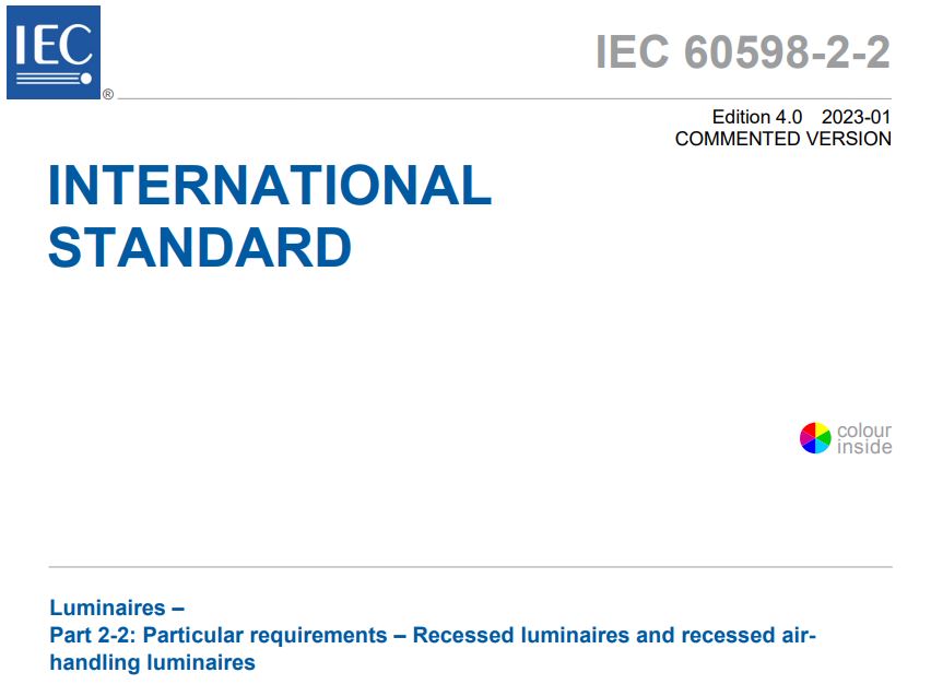 IEC 60598-2-2:2023 specifies requirements for recessed luminaires incorporating electric light sources for operation from supply voltages up to 1 000 V. It also specifies requirements for recessed air-handling luminaires for use with a ventilation duct or ventilated space (plenum).