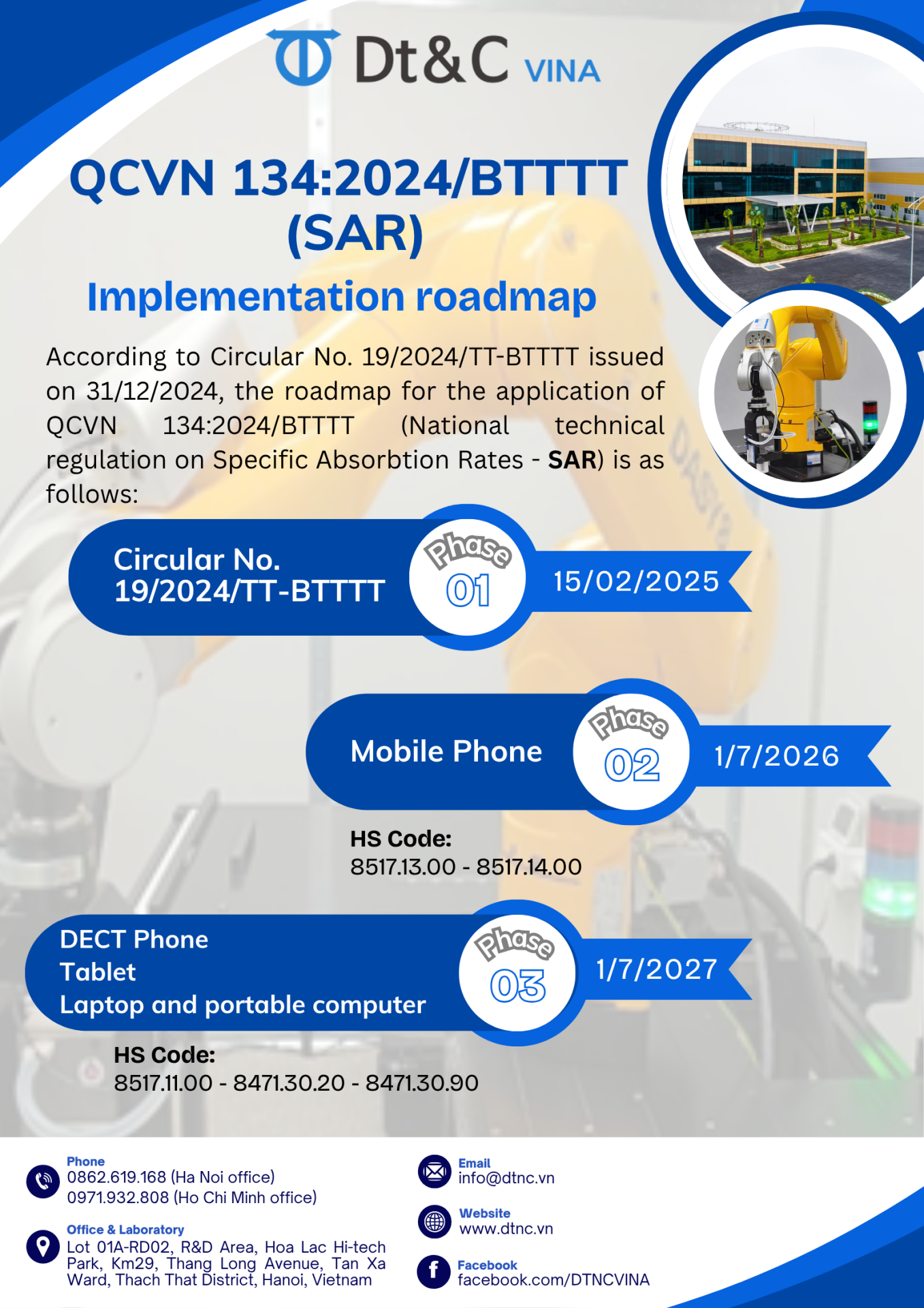 Dt&C Vina would like to summarize the implementation roadmap of QCVN 134:2024/BTTTT (National Technical Regulation on Specific Absorption Rate - SAR) as stipulated in Circular No. 19/2024/TT-BTTTT, issued on December 31, 2024, as follows: