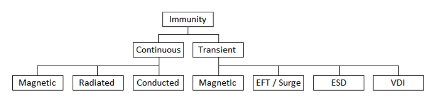 Thử nghiệm miễn dịch EMC (EMC Immunity testing) có thể được coi là liên tục hoặc nhất thời về bản chất. Thử nghiệm liên tục được áp dụng cho một sản phẩm để mô phỏng độ gần RF có thể xảy ra trong thực tế. Hiện tượng nhất thời thường là sự kiện ngắn liên quan đến sự bùng nổ năng lượng.
