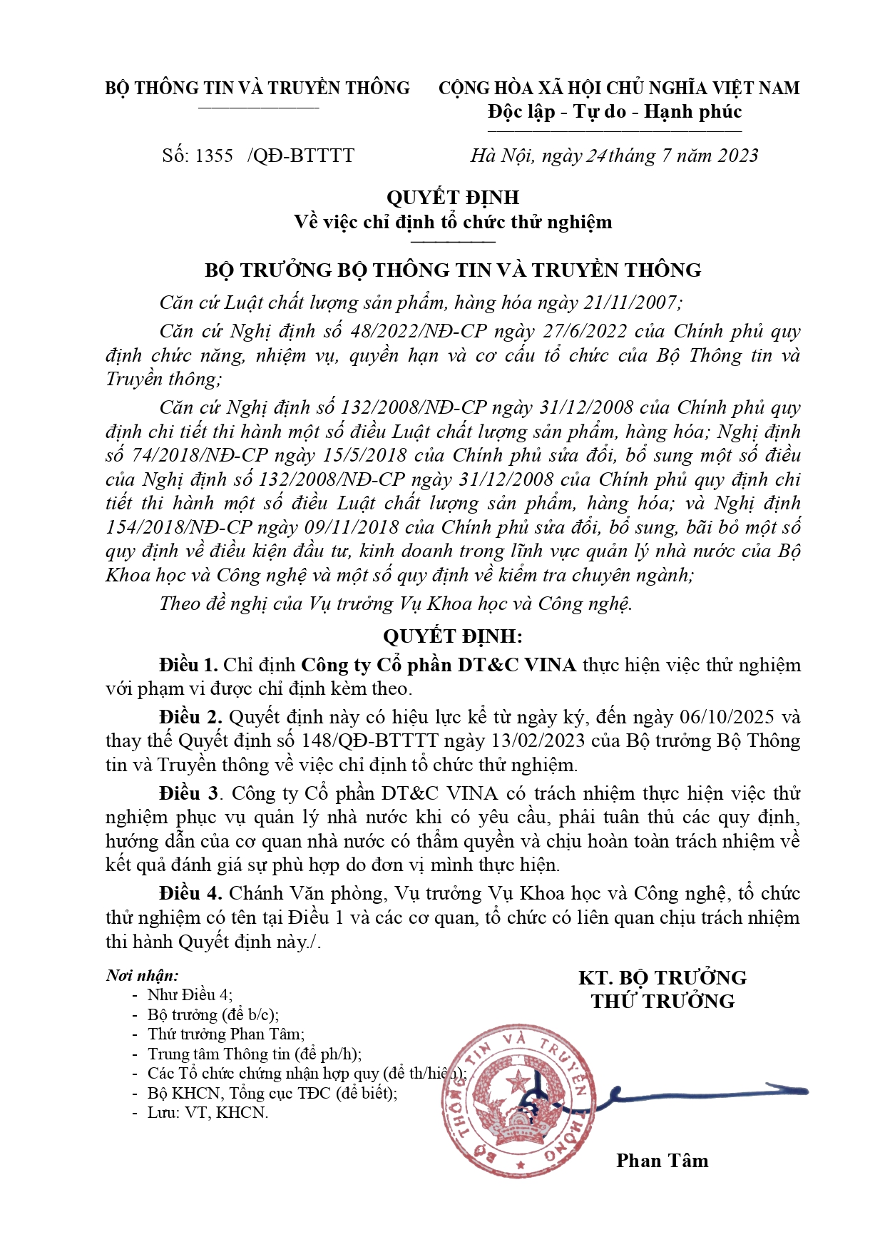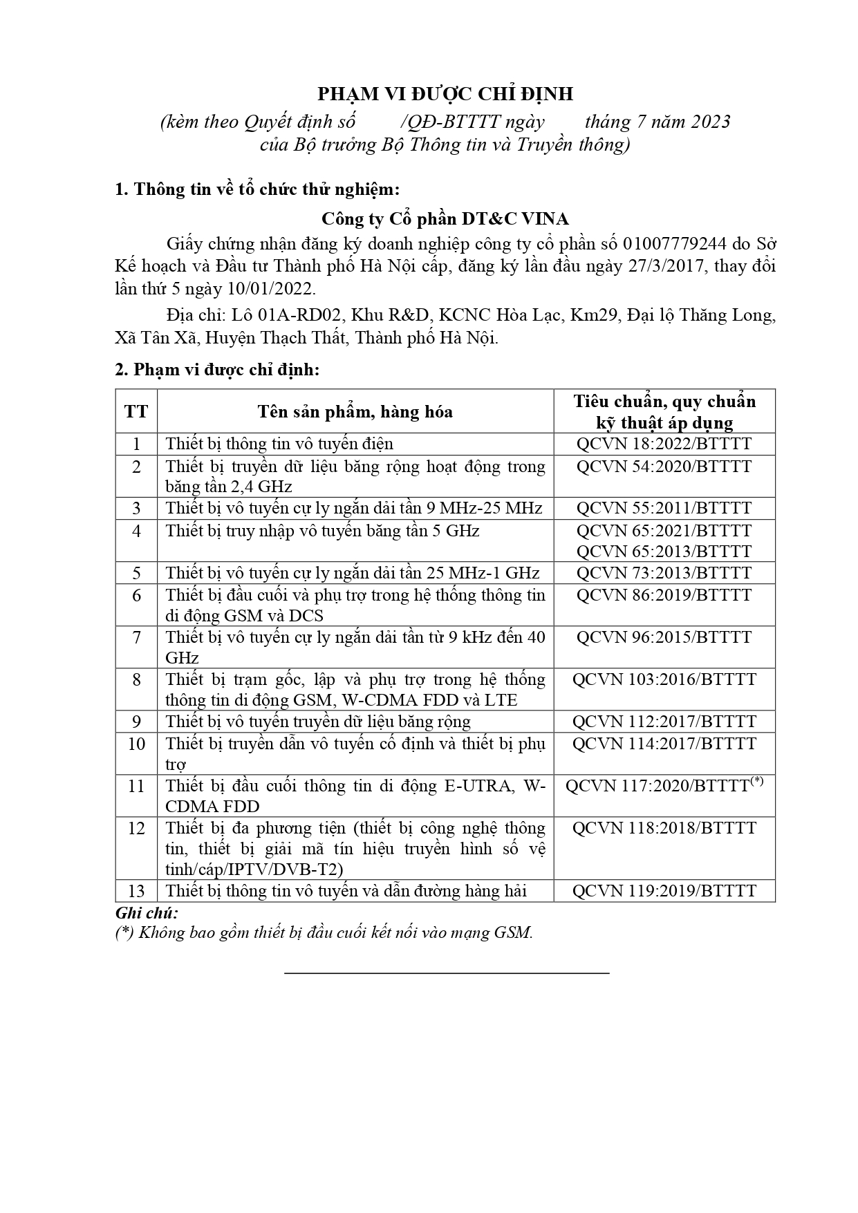 Dt&C VINA officially received the license to implement QCVN 18:2022/BTTTT, with strict working process, compliance with lab regulations and a team of experienced engineers and experts, we are committed to doing the right process and technical requirements according to state regulations, ensuring project progress, accurate and quick test results to customers. All products tested at Dt&C VINA lab must be strictly confidential according to regulations.